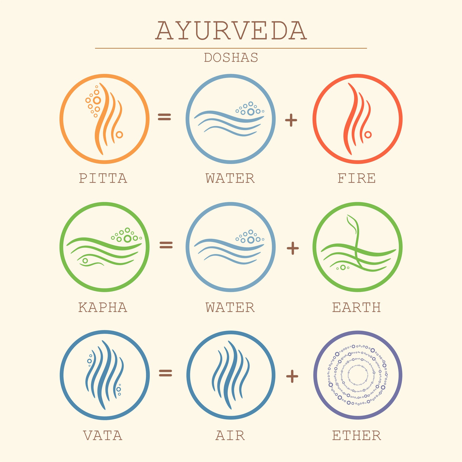 The 5 elements combine in 3 ways, called the doshas, which govern your physical, physiological, and psychological functions (such as your metabolism).